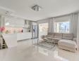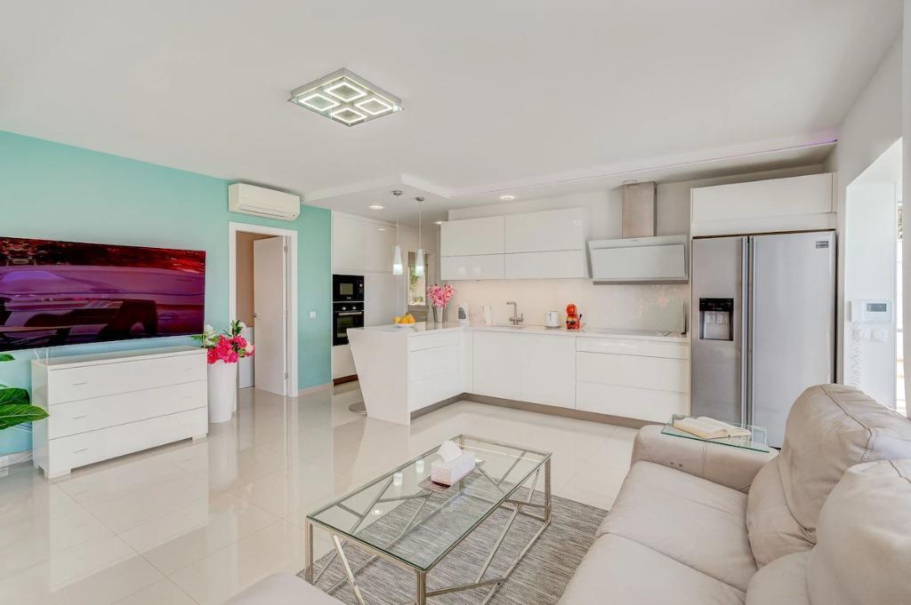 The interior is modern, bright, and welcoming. The open-plan living area offers comfortable seating, large windows allowing plenty of natural light, and direct access to the outdoor space. The American-style kitchen is fully equipped with all appliances and utensils, making it ideal for preparing meals and dining together at home.